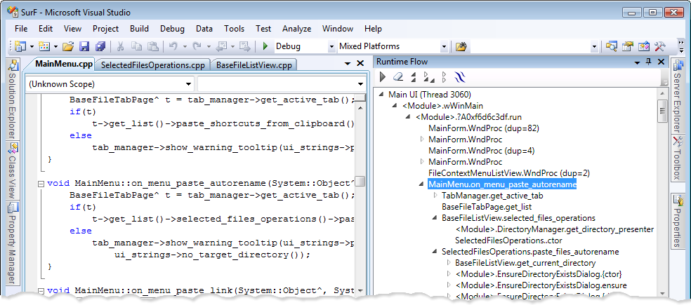 Runtime Flow v1.0 integrates with Visual Studio 2005/2008 and monitors .NET 2.0 – 3.5 desktop applications. Both x86 and x64 platforms are supported.