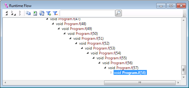 When viewing deep function calls in the Runtime Flow window you may hit a WPF layout recursion limit. To illustrate this problem I created a very simple application: